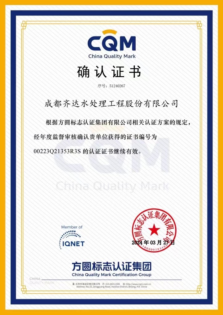 2024年3月6日至3月8日方圆标志认证集团四川有限公司对我司现有ISO管理体系(QMS、EMS、OHSMS)进行监督审核,经监督审核我司管理体系证书继续有效。